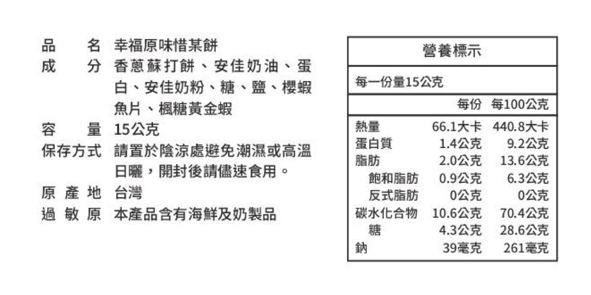 人氣牛軋餅注入新創意,加入特選東港 黃金蝦與櫻蝦魚片;搭配香脆蘇打餅與甜滑牛軋糖,展現鹹、甜、甘多層次口感!